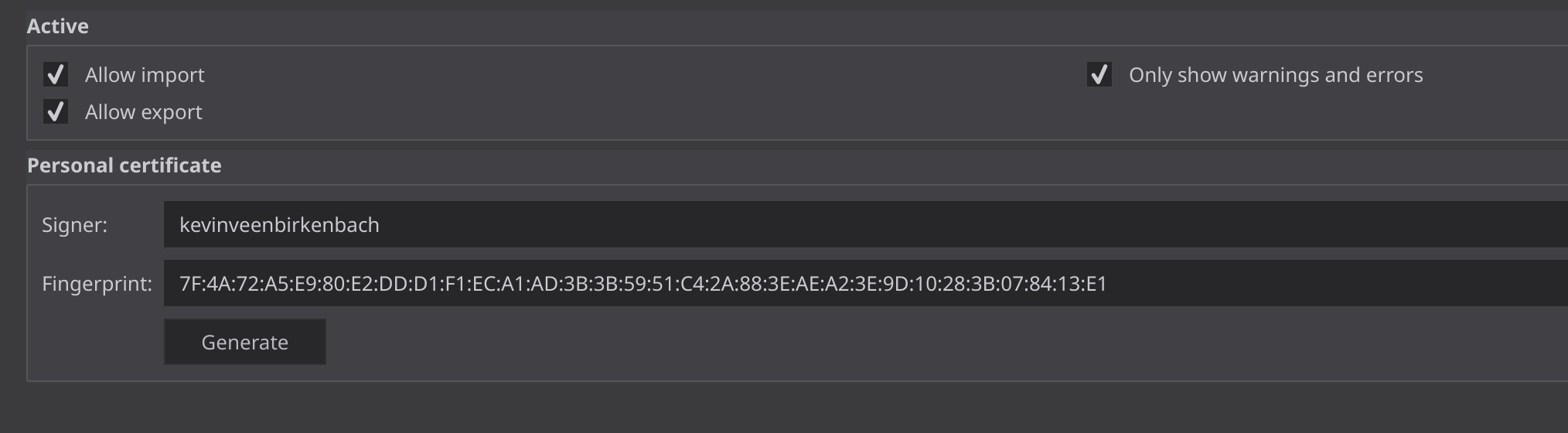 - Generate your personal certificate/signing key if prompted (you’ll see a “Signer” name + fingerprint).